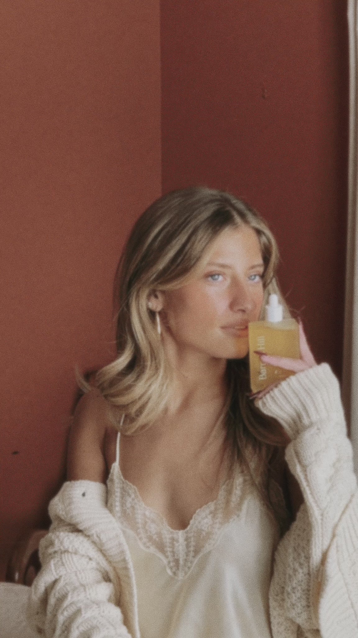 Golden Jojoba Oil (soothes), Vitamin E Oil (moisturizes), Organic Rosehip Seed Oil (improves texture), & Organic Rosemary Oil (anti-aging)